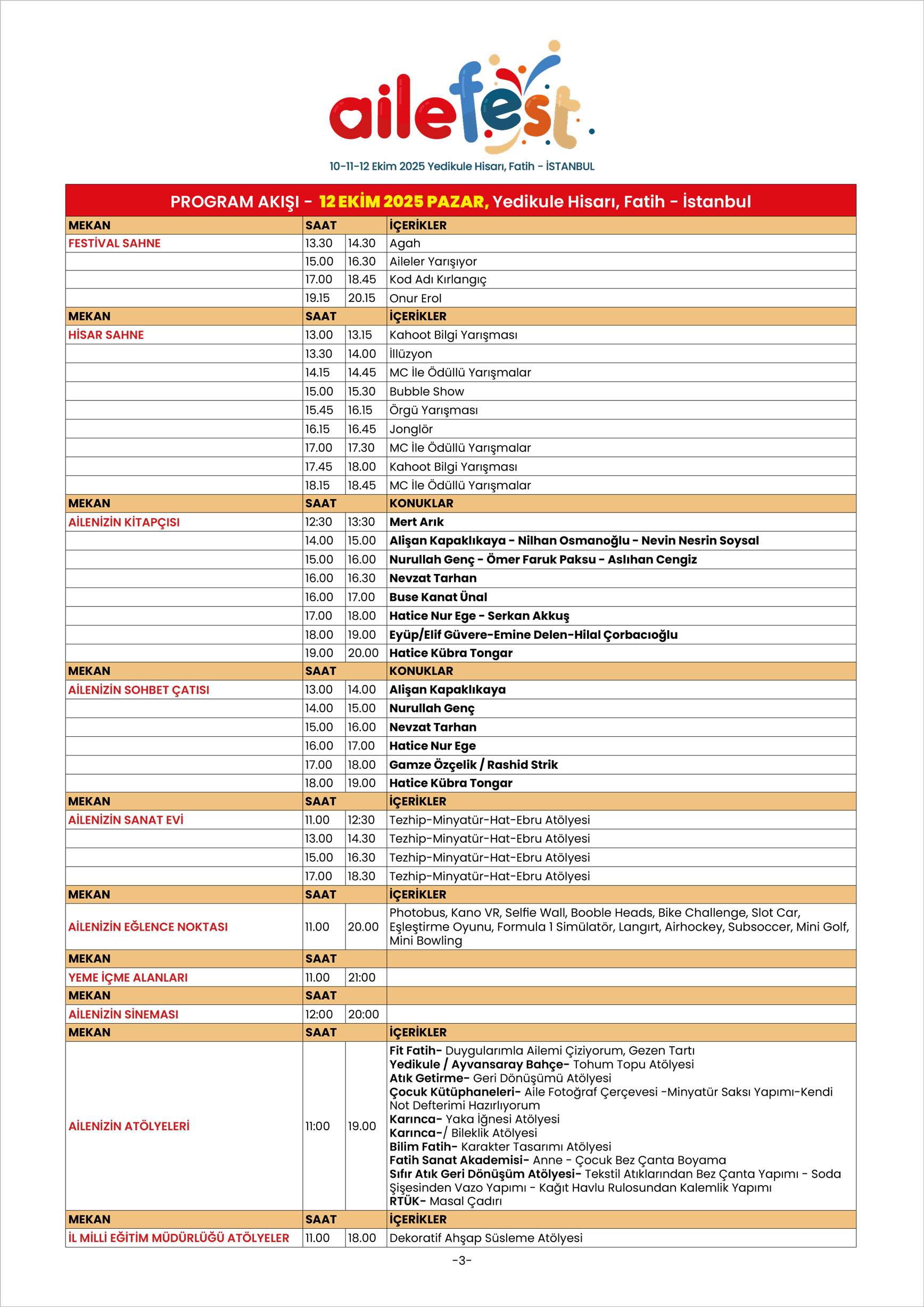 Üç gün boyunca 50 binden fazla kişinin katılması beklenen Aile Festivali, aile bireylerine birlikte öğrenme, paylaşma ve eğlenme imkânı sağlayarak kuşaklar arası etkileşimi güçlendirmeyi hedefliyor. Yedikule Hisarı’nın büyüleyici atmosferinde gerçekleşecek bu özel buluşma, ailelere unutulmaz anılar biriktirme fırsatı sunacak.